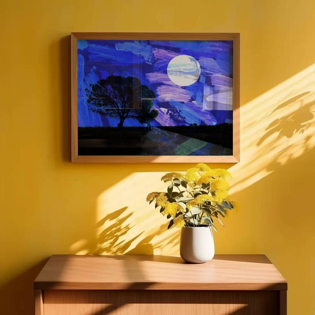 “Moonlight” is one of my more recent compositions — bold, layered brushstrokes and a glowing full moon over a lone tree in Los Toruños Natural Park.