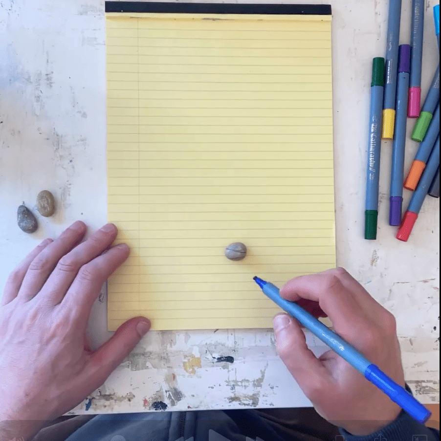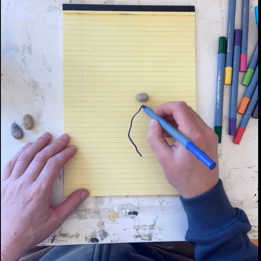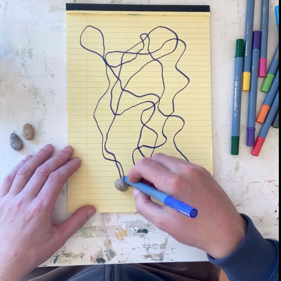A small moment, a simple pebble. I am currently enjoying this process of pushing and following a pebble across paper with one of my coloured pens, letting it leave its own wandering marks, its own quiet map.