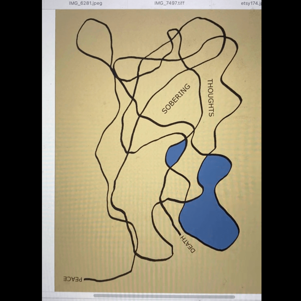 Un momento pequeño, un simple guijarro. Ahora mismo estoy disfrutando este proceso de empujar y seguir un guijarro sobre el papel con uno de mis bolígrafos de colores, dejando que trace sus propias líneas errantes, su propio mapa silencioso.