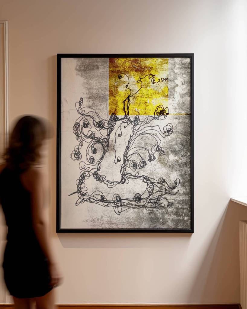 Dibujo en tinta negra, escaneado, con fondo añadido en el ordenador.